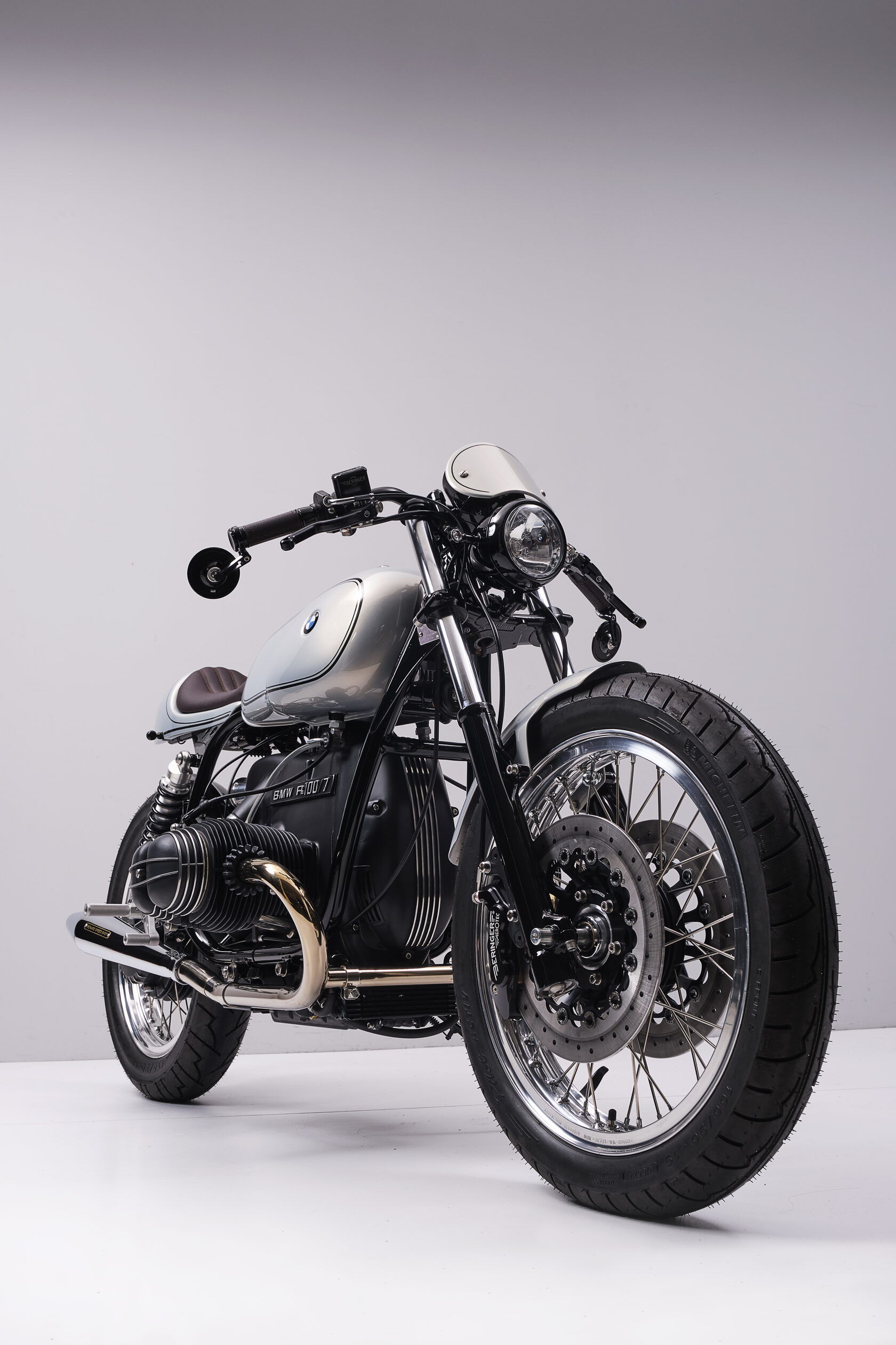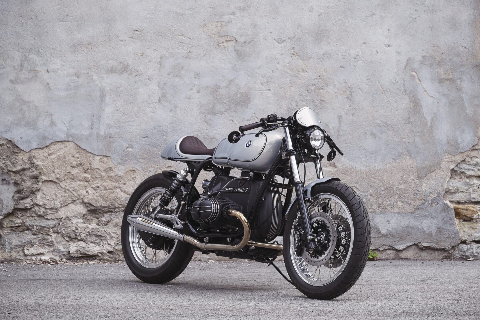 Frame, engine, gearbox and shaft are fully restored and improved. Wheels came from famous Italian Borrani manufacture. Rear suspension Öhlins. Break system Beringer. As well as break and clutch livers. Foot pegs from Tarozzi and Rizoma back break fluid reservoir. Spido from Motogadget as well as mirrors and m unit blue. Carbs are from famous Italian racing company Dellorto (PHM38). The color is Moonstone metallic, original BMW paint from BMW F80 M3. Seat is handcrafted and finished in dark chocolate leather as well as handle bars. Tank, saddle and tail are fully custom made.